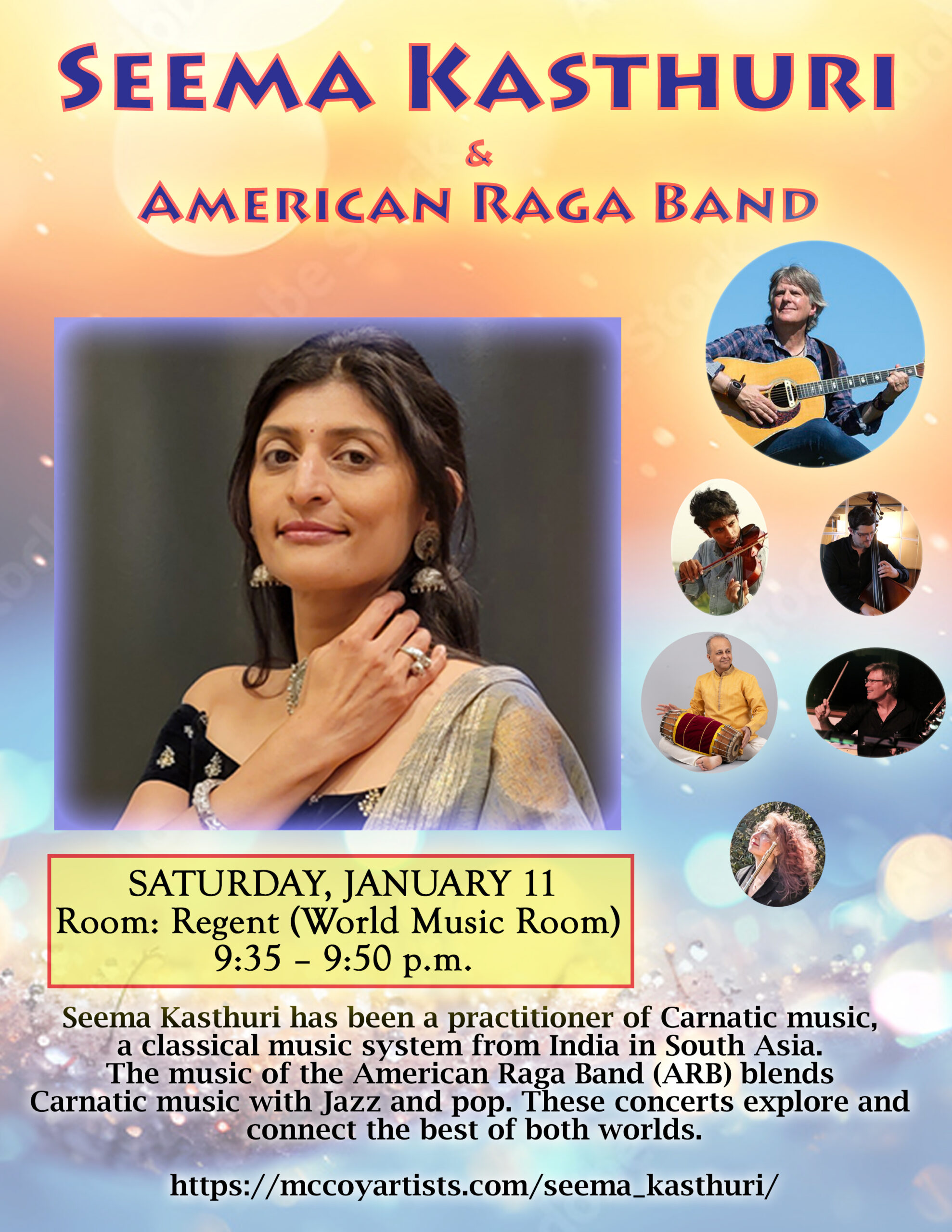 Seema believes there is a fine thread that runs through connecting all humans and how Eastern spirituality is an answer to peace within Collaborating with the renowned award-winning, innovative American guitarist, composer Todd Mosby, Jazz drummer Steve Davis, and drummer Prasanna Kasthuri, has taken Seema over the horizon regarding her experiences in world music. The band of six musicians called “The American Raga” performs traditional North and South Indian music along with Indo-Jazz improvs and classical Beetles!